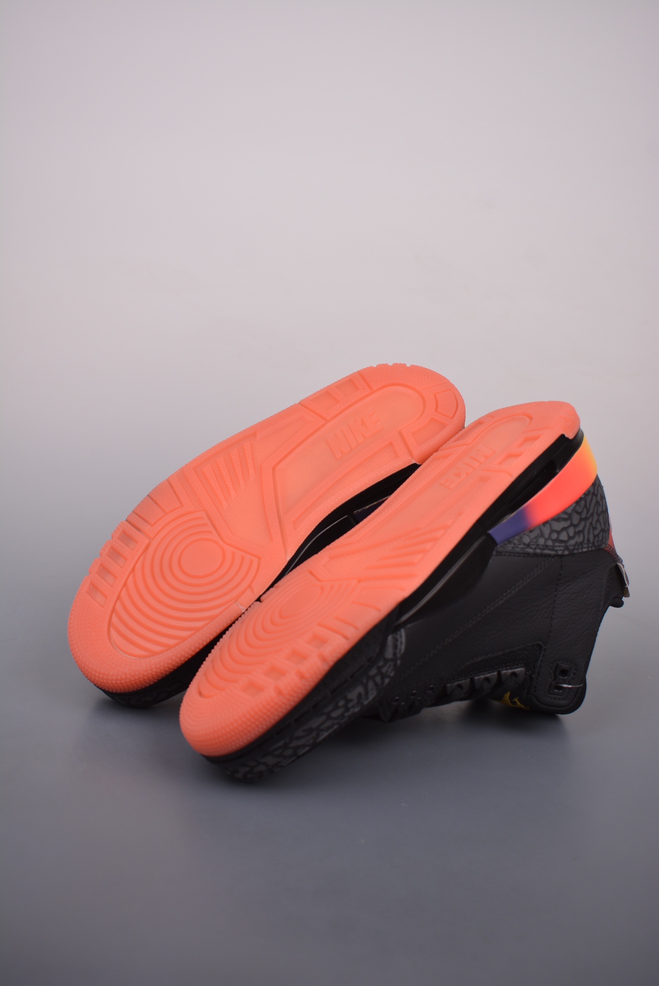 The J Balvin x Air Jordan 3 Retro 'Rio' takes its name from the reggaeton artist's son. The legacy silhouette carries a black leather upper with grey elephant print overlays at the forefoot and heel. Gradient accents in Solar Flare and Total Crimson Abyss coat the back tab, marked with Nike Air branding on the left foot and J Balvin's smiley face logo on the right. The sunset colors are repeated on the rear of the polyurethane midsole, supported by a red-tinged translucent rubber outsole.