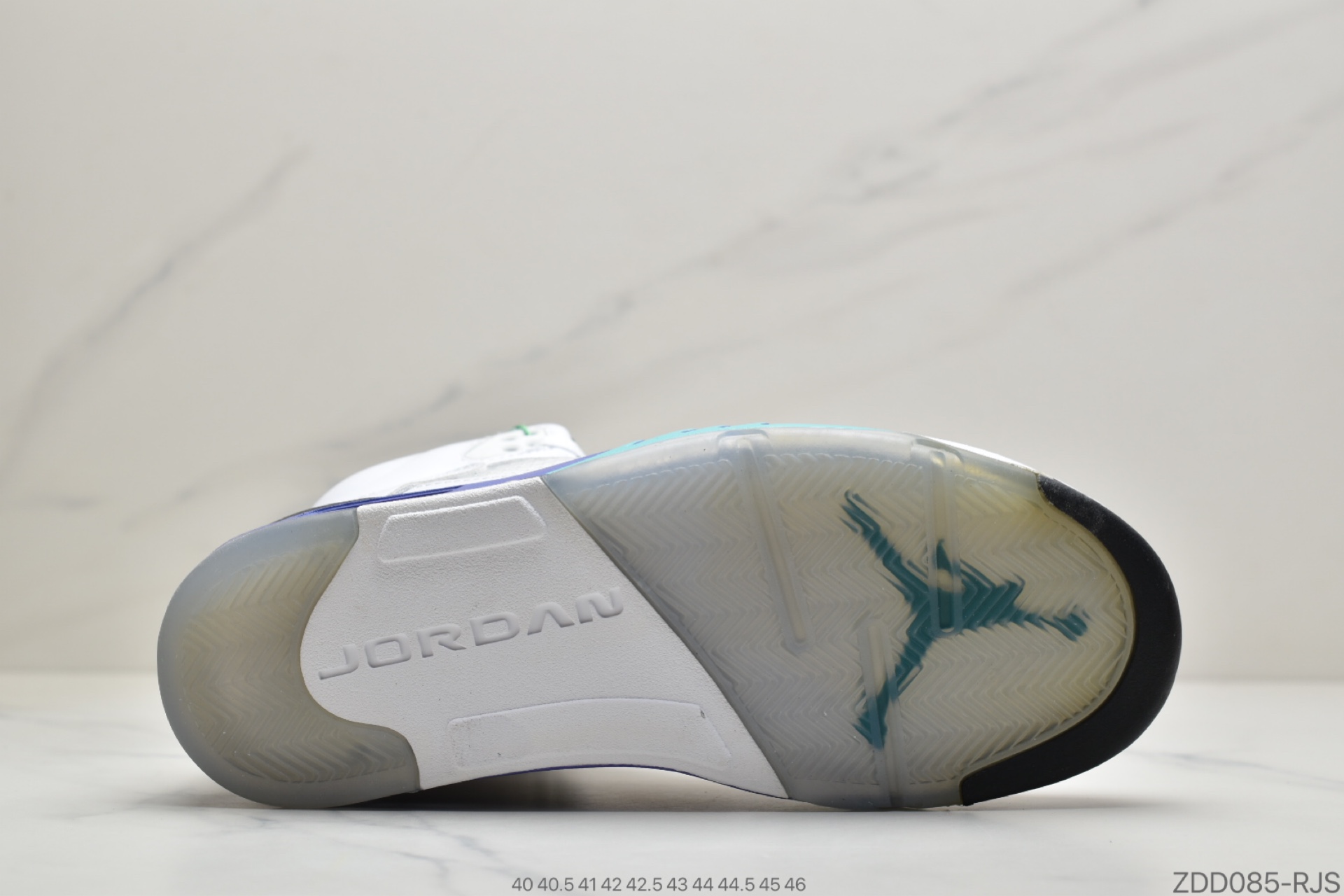The 2025 edition of the Air Jordan 5 Retro 'Grape' revives an OG colorway of the legacy silhouette. True to the 1990 release, Tinker Hatfield's classic design features a white leather upper with ventilated quarter panel netting and molded TPU eyelets. Atop the tongue, a teal embroidered Jumpman stands out against a purple backdrop. Nike Air branding decorates the back heel. The sneaker rests on a violet polyurethane midsole with turquoise shark tooth detailing and a visible Air-sole unit in the heel. A translucent rubber outsole provides durable traction underfoot.