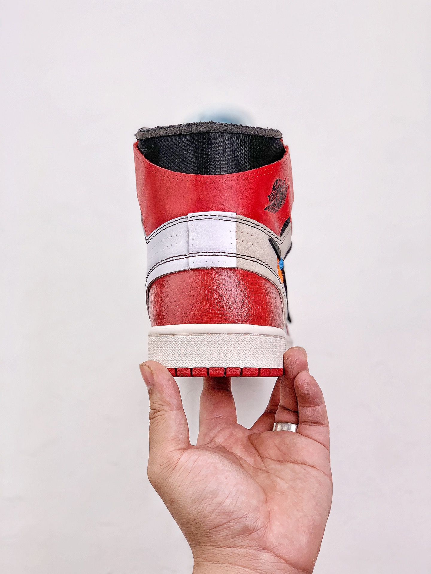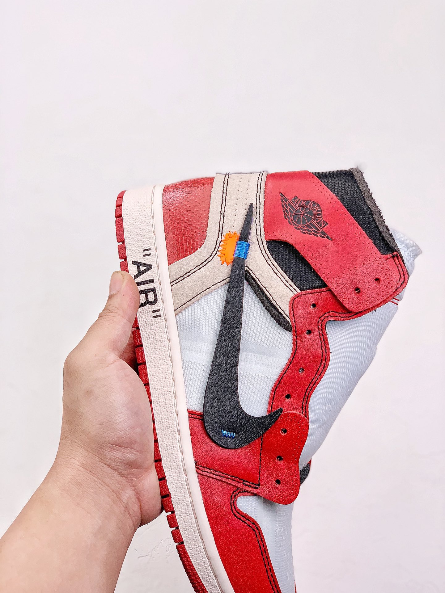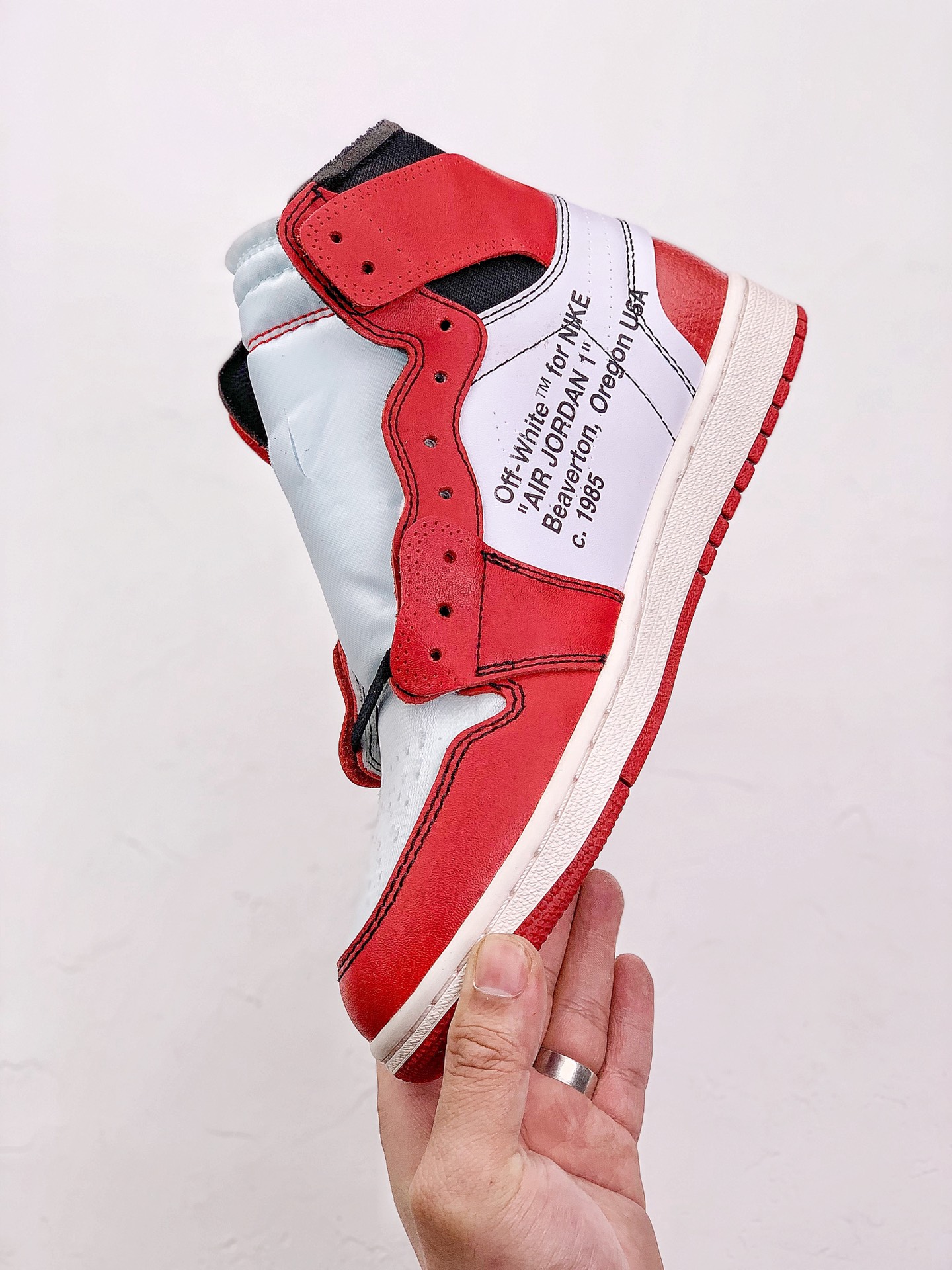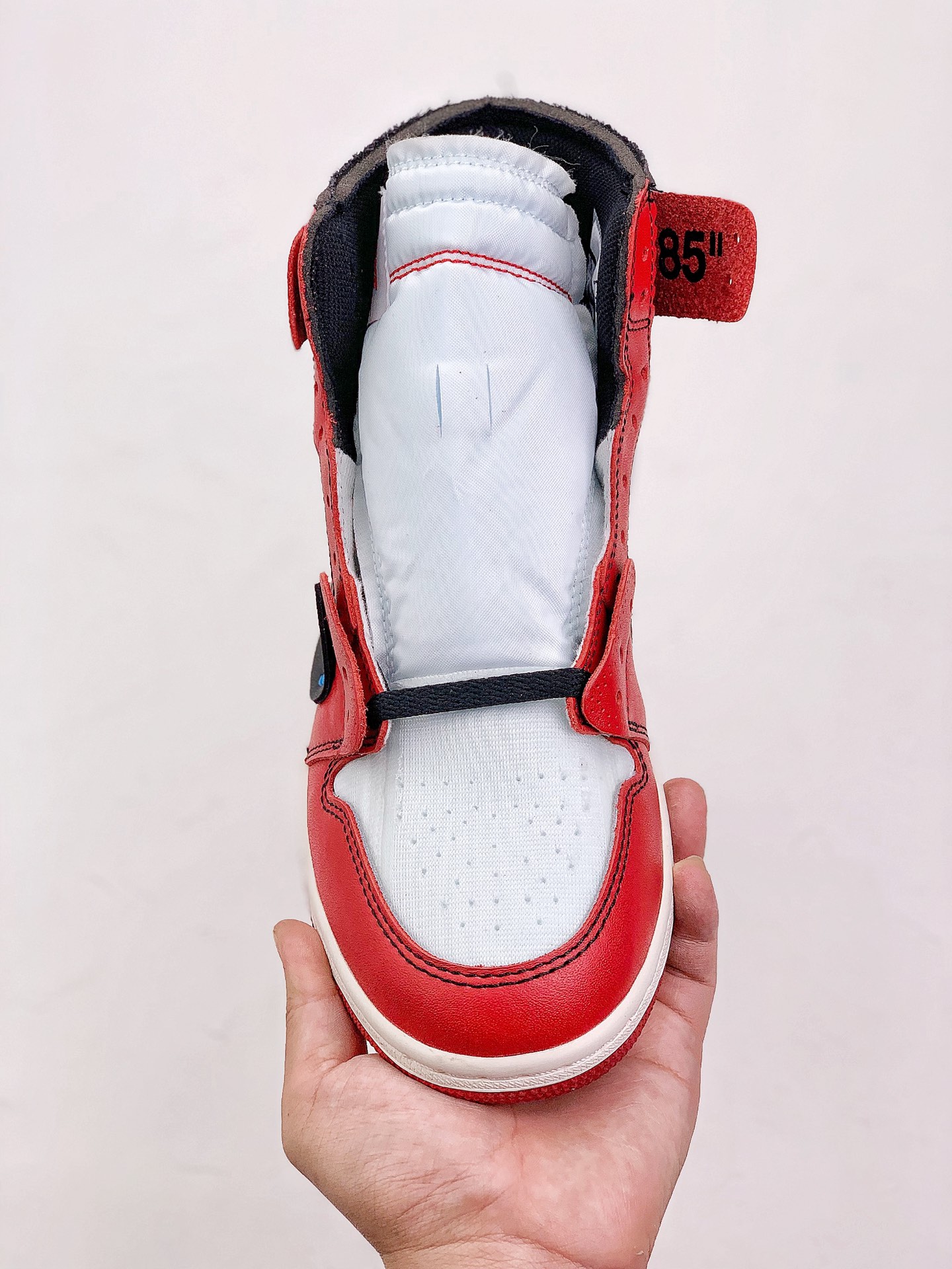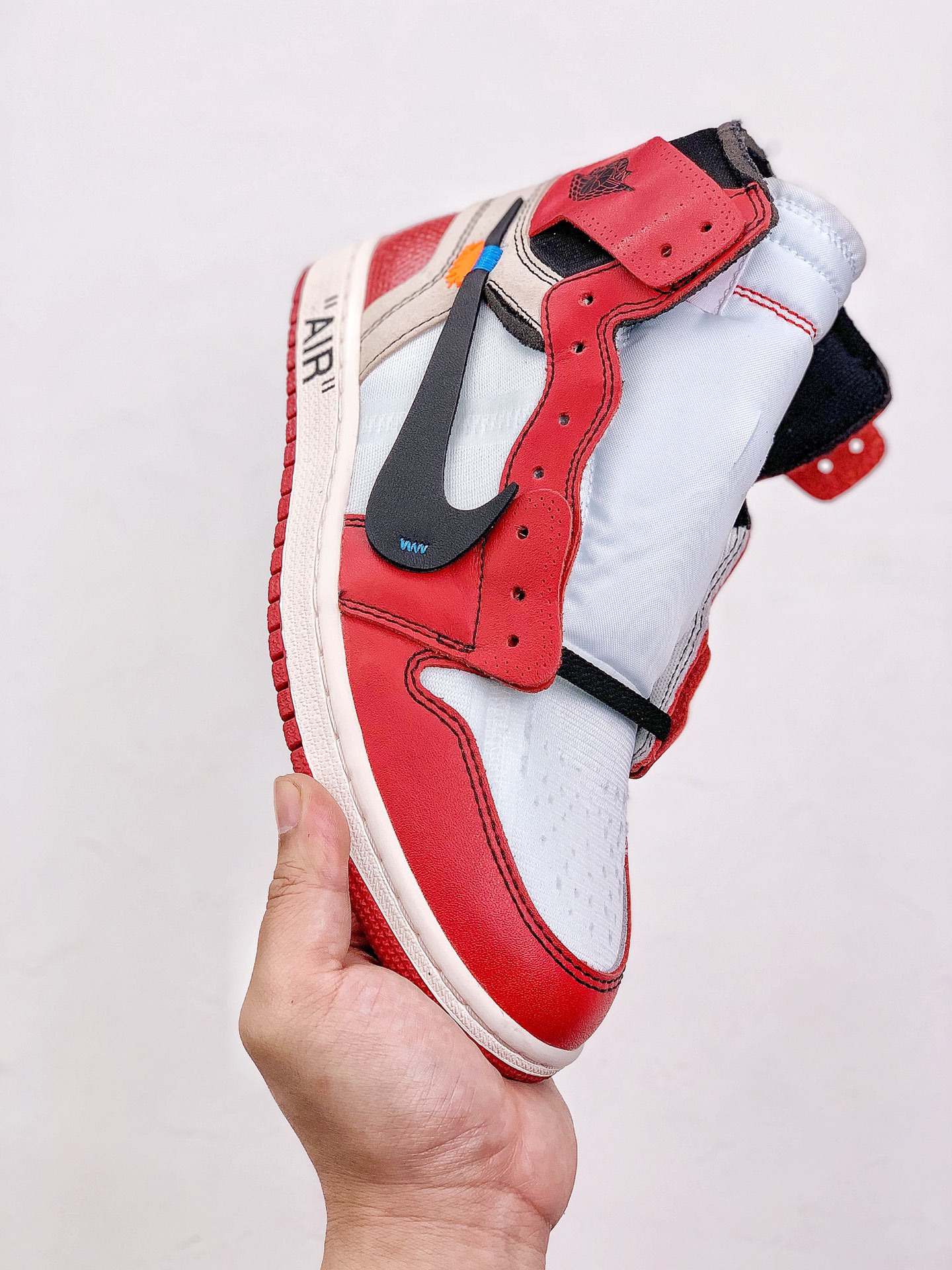 In terms of design, it incorporates Off-White's deconstructed style. The upper is made of high-quality leather, and the toe box is made of mesh material. Details such as dotted lines, peeling effects, and exposed foam on the upper increase the personality and uniqueness of the shoe. The tongue has Off-White's iconic double tags and the word "SHOELACES", the midsole has the eye-catching "AIR" lettering, the medial side has text referring to Nike's Oregon headquarters, and there is also a red zip-tie on the shoelace, which are all classic design elements of Off-White. In addition, the ankle stabilizer can be opened to reveal the "85" 字样 underneath, representing the year when the Air Jordan 1 was first released.