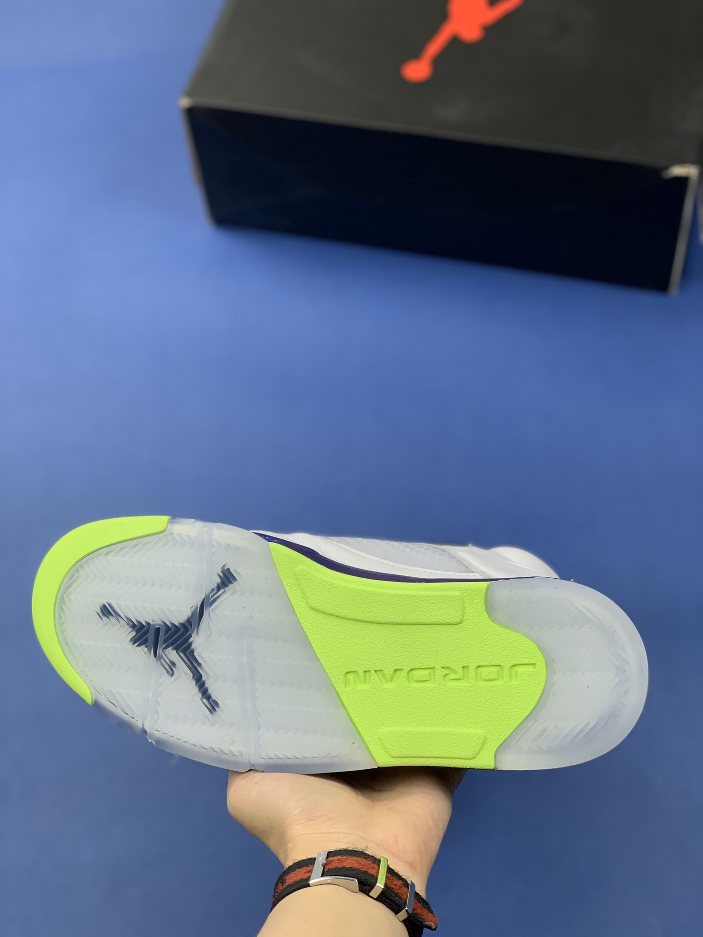 Colorway: A crisp white leather upper contrasts with a bold purple midsole, paying homage to the original "Grape" AJ5 worn by Will Smith on the show. Mismatched neon accents—including green and pink Jumpman logos on the tongues and dual-tone "23" embroidery on the lateral heels—add playful nods to the sitcom’s colorful aesthetic.