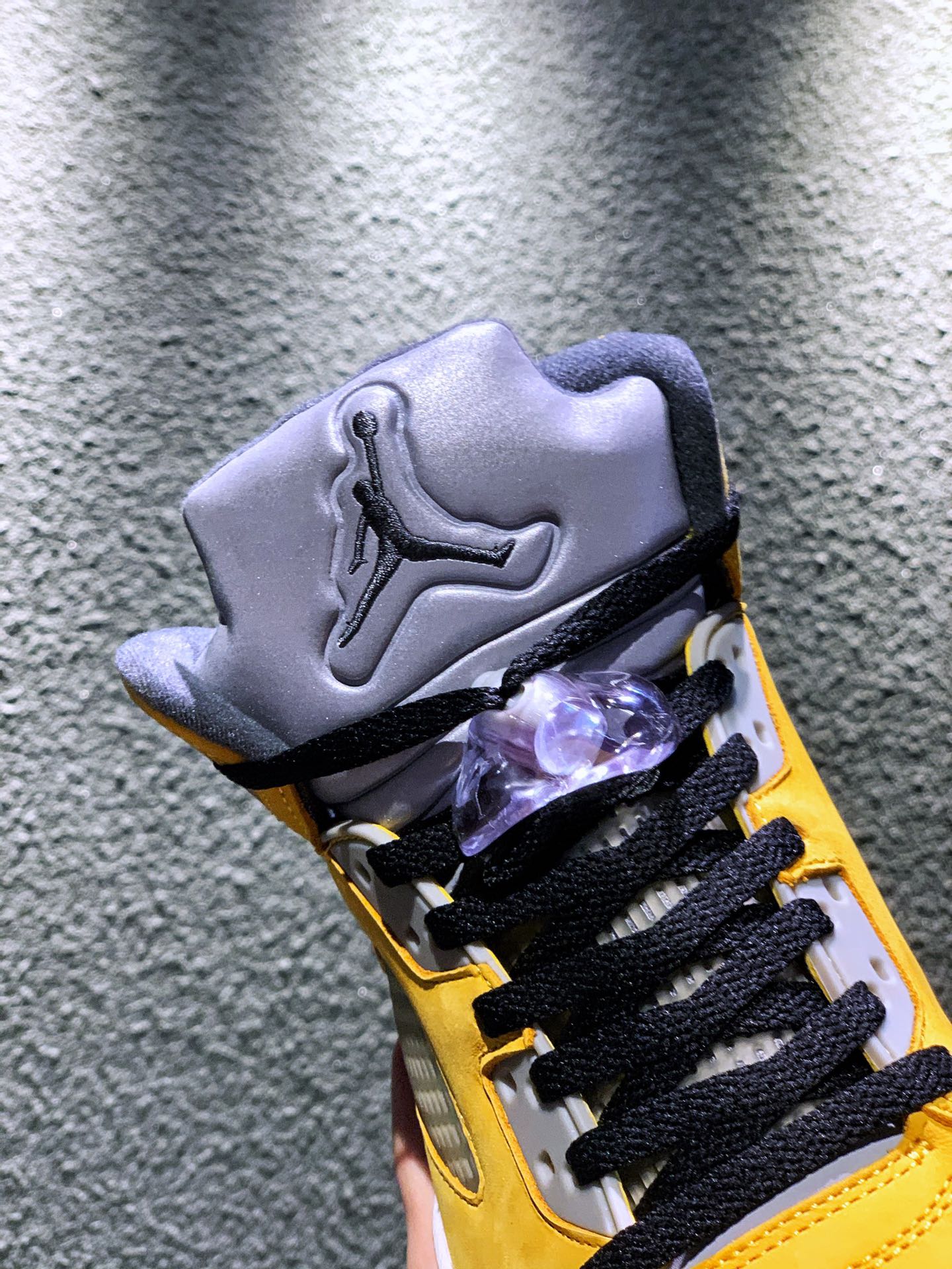 Released in August 2019, the Air Jordan 5 Retro 'Michigan' sneaker pays homage to the legendary Michigan Wolverines through official team colors. Its Amarillo nubuck upper is tooled with TPU mesh midfoot inserts, toggled lacing and a forward-facing, embroidered Jumpman. The style's moniker is worn on the reflective tongue, with a retro tag stitched to the heel. A speckled shark tooth graphic is placed on the sidewall, finished off with a Navy midsole that showcases the visible Nike Air unit and an icy translucent outsole.
